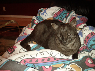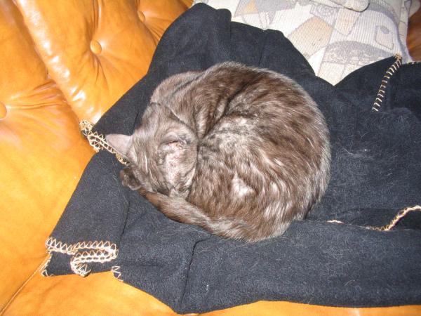 This is strange behavior for him, he never sleeps there, he usually sleeps on our spare blankets, a pillow on the couch, or in our bed with us. When Michael saw him on my clothes friday morning he moved him to a pillow on the couch, but he immediately went back into our bedroom to sleep on my clothes. Very odd indeed. He didn't move from his place on my clothes when I filled up his food bowl this morning, which he usually runs to investigate. I was glad Michael is working from home fridey and could keep an eye on him.