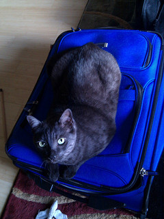 I've been traveling more since moving out here, so both kitties have had to get used to us being gone. Early on we had friends drop in to take care of them, but we now hire a pet sitter who can take care of Simcoe's special needs (she was diagnosed with kidney disease in December 2011). I think they know what suitcases mean now, and Caligula never passes up an opportunity to take a nap on one: