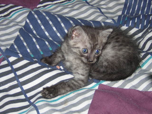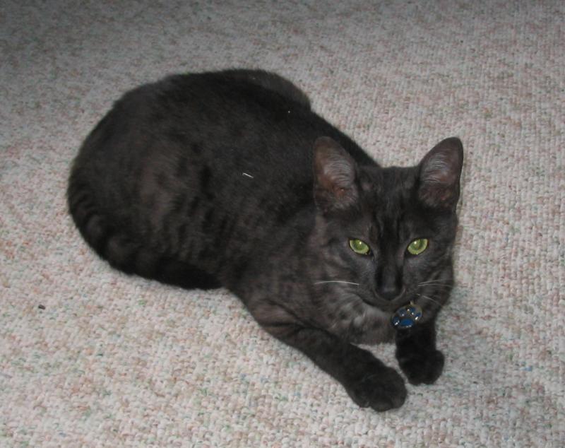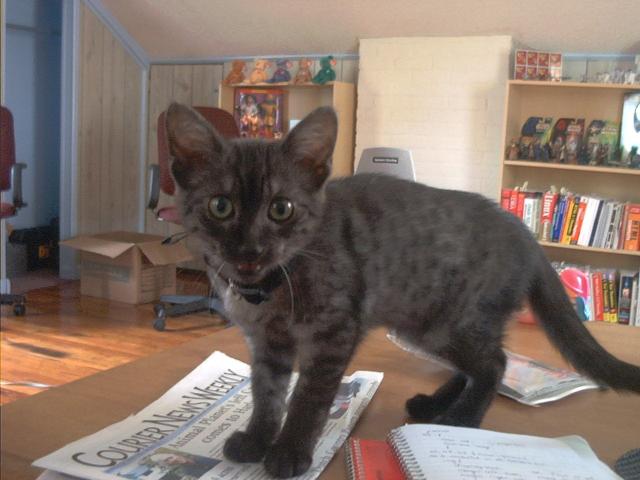 Caligula seems to be calming down more. He still walks around an meows a bit, but not nearly as much as before. For the most part he's letting us sleep through the whole night now, when he does wake up he leaves the bed and room to go play. He seems to be quite fond of sleeping on my lap while I'm on the computer. Unless of course work emails me and I need to do real work, then he's walking all over me and getting in my way %) He loves the little toy mouse that we got him, and already is starting to play fetch with us from time to time, it's so cute! And he needs to learn the difference between people food and kitty food. He climbed up Michael's leg about half a dozen times during each dinner we've had at the table since bringing him home. Last night he wouldn't leave us alone while we were eating brownies in bed while watching an MST3K tape. This morning I dropped a piece of my pistachio muffin on the desk this morning and he ate it.