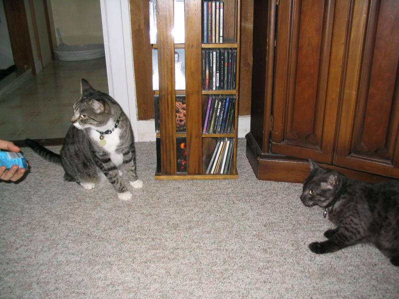 Things were a bit scary at first, a lot of puffy fur, hissing, growling, but both of them eventually calmed down a bit. Caligula got into the habit of chasing Cargo through the house, and that always ended in some growling. But as the weekend progressed, they got more used to each other, so they could at least be in the same room without going crazy. And we were happy that neither of them was hurt in the slightest by each other.