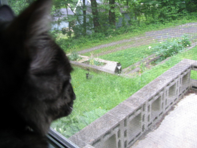 This picture shows two cats outside, while Caligula is sitting on the window sill inside, he was meeting his neighbors all puffy tailed.