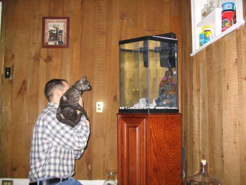 Recently we purchased a couple angelfish, and Caligula has expressed quite a bit of interest in them. Luckily the tank is up high enough so he can't torment them *too* much.