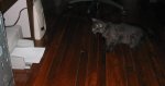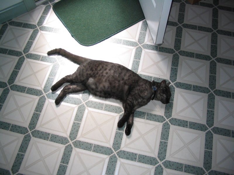 Sleeping on the kitchen floor one morning.