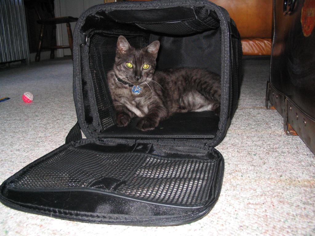 Relaxing in his cat carrier.
