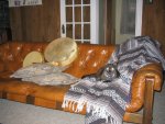 With drums and Native American blankets.
